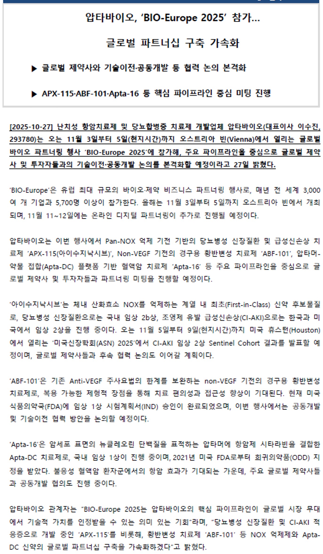 [25.10.27] 압타바이오, ‘BIO-Europe 2025’ 참가…글로벌 파트너십 구축 가속화