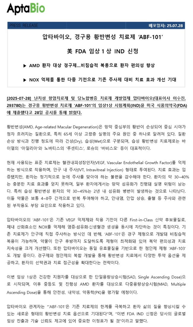[25.07.28] 압타바이오, 경구용 황반변성 치료제 ‘ABF-101’ 美 FDA 임상1상 IND 신청