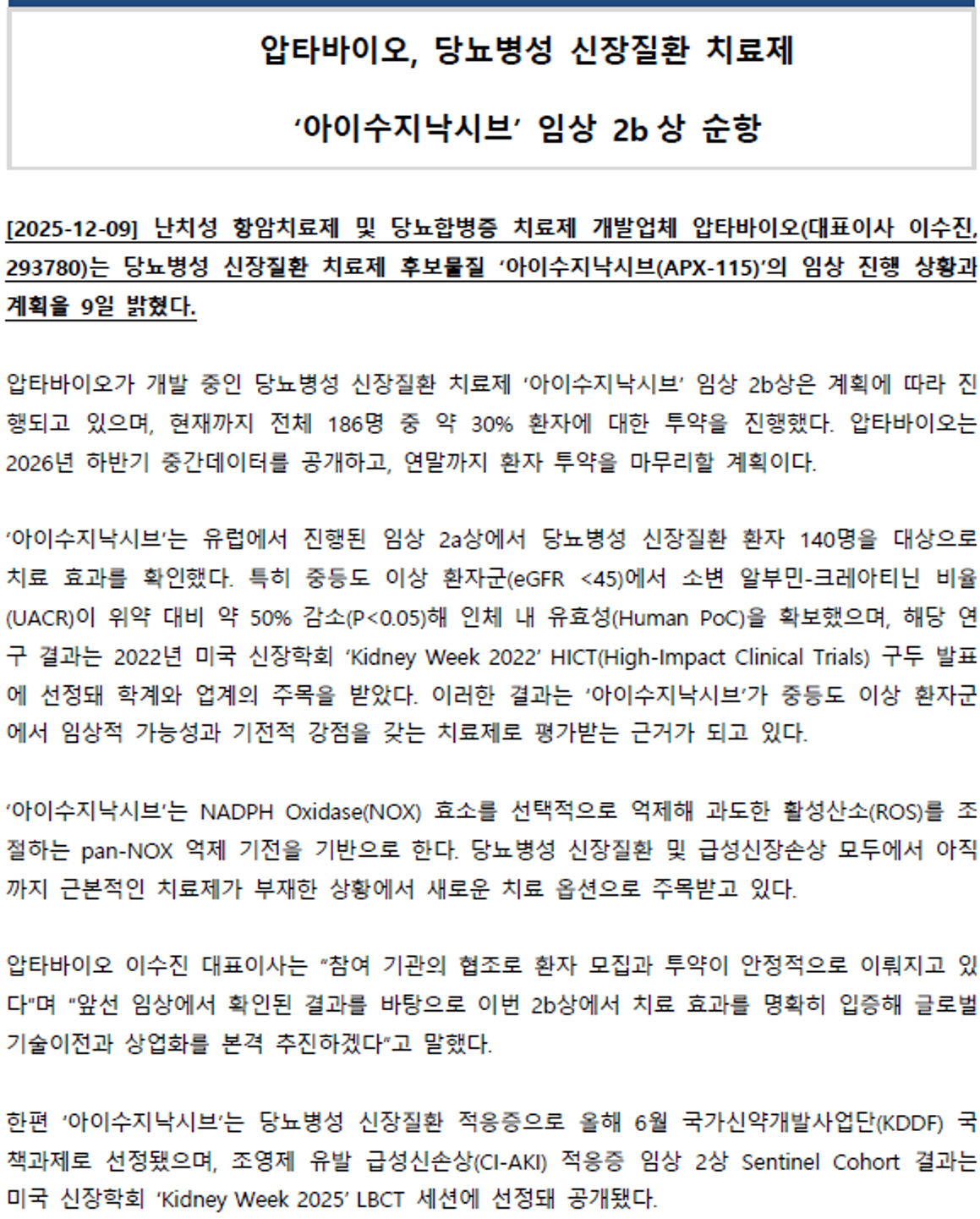 [25.12.09] 압타바이오, 당뇨병성 신장질환 치료제 ‘아이수지낙시브’ 임상 2b상 순항