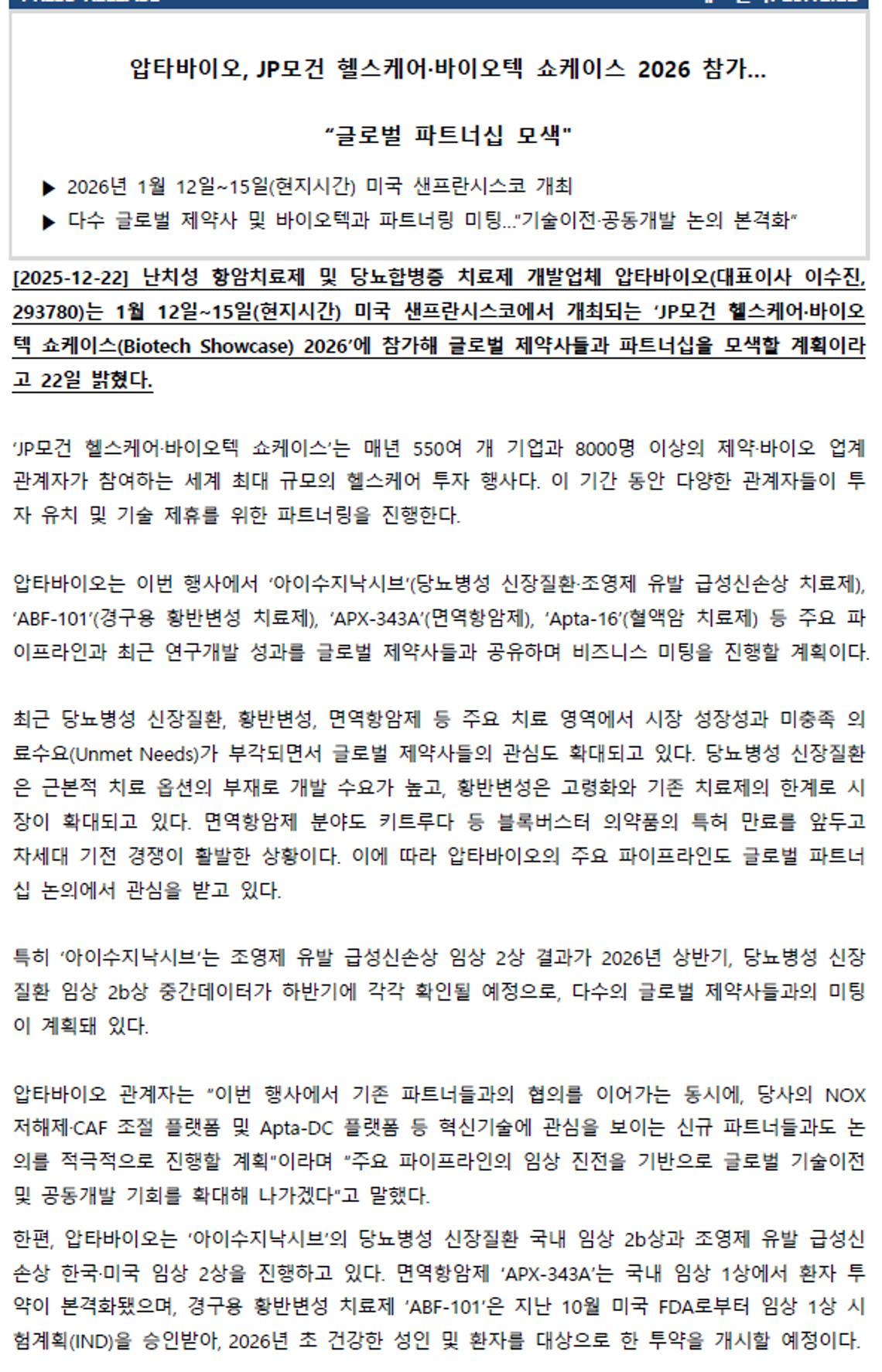 [25.12.22] 압타바이오, JP모건 헬스케어·바이오텍 쇼케이스 2006 참가... "글로벌 파트너십 모색"