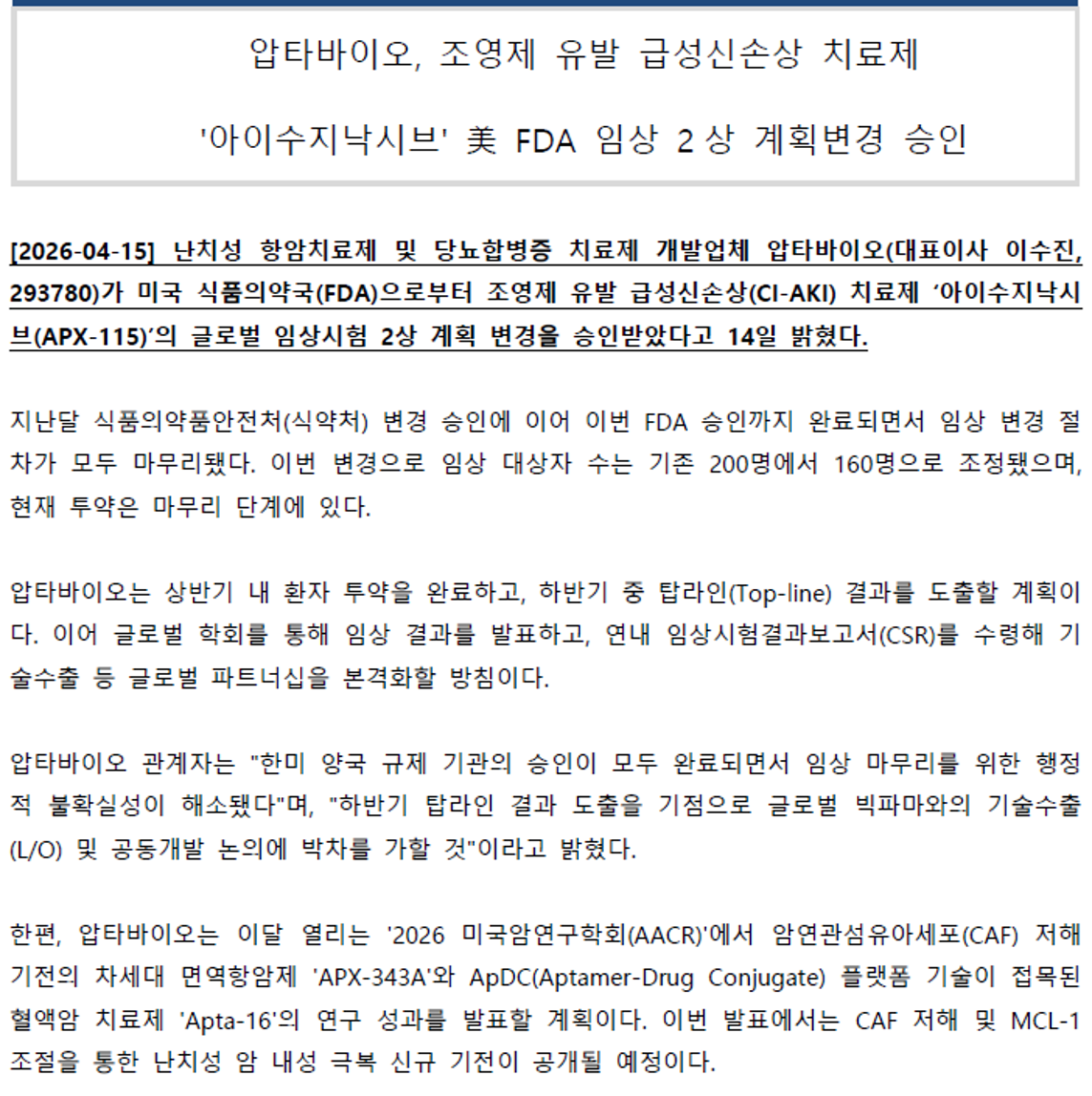 [26.04.15] 압타바이오, 조영제 유발 급성신손상 치료제 '아이수지낙시브' 美 FDA 임상 2상 계획변경 승인